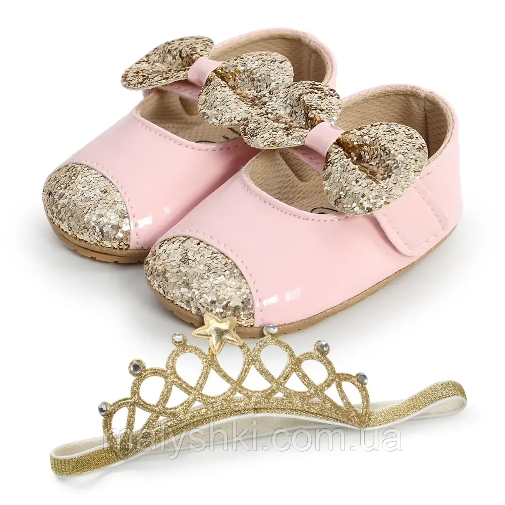 Ошатні туфельки-пінетки і красива пов'язка на голову для вашої маляти. Дуже м'які та зручні пінетки для малечі які сидять у колясці, або робить свої перші кроки. Верх туфель шкірозамінник, всередині текстиль. Підошва тонка гума. Легко взуються, добре виглядають на ніжці. Застібка на липучці. Розмір 13 внутрішня устілка 12.7 см. Дивіться всі наші товари для дітей: сукні, пов'язки на голову, перше взуття, костюми для хлопчиків, колготки, джинси, взуття, верхній одяг та інше. Весь асортимент у нашому магазині malyshki.com.ua.
